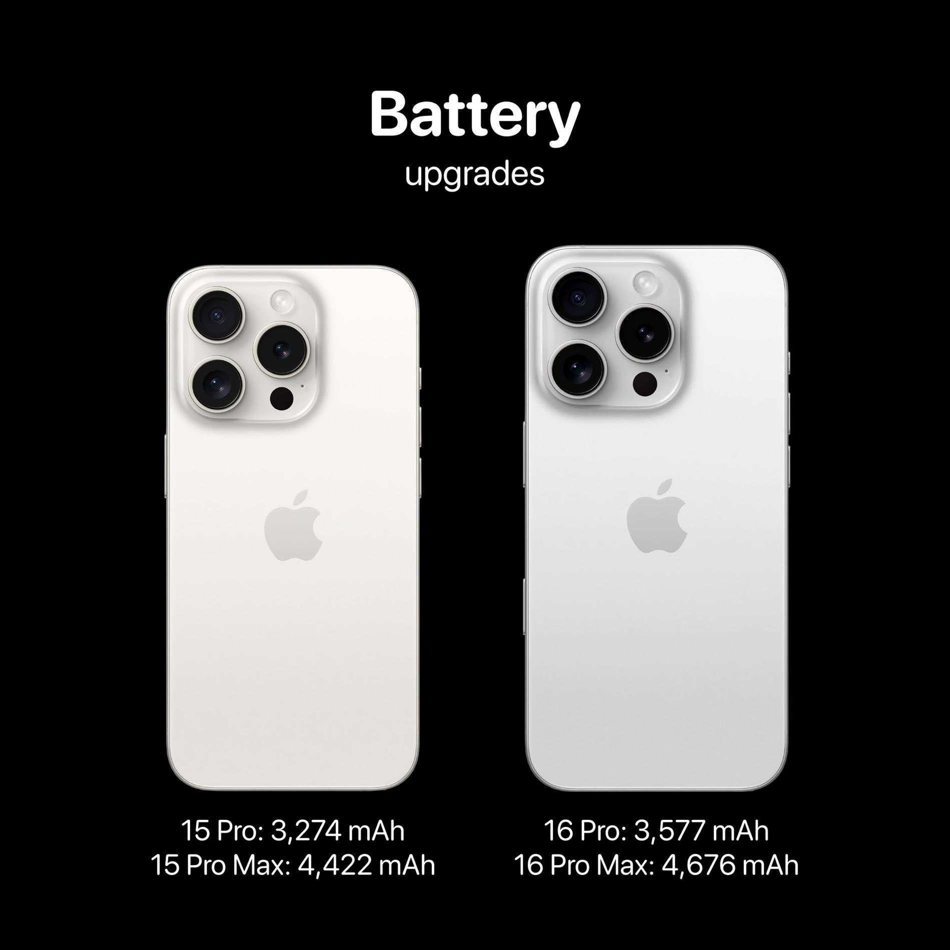 15 Pro’da 3.274 mAh, 15 Pro Max’te ise 4.422 mAh batarya kapasitesi yer alıyordu. 16 Pro serisinde kapasiteler artırılarak 16 Pro’da 3577, 16 Pro Max’te ise 4.676 mAh’a çıkartılıyor. Batarya teknolojisi olarak tek katlı batarya yerine yığın batarya teknolojisine sahip olacak. Son olarak 27W kablolu, 15W ise kablosuz şarj yerini 16 Pro serisinde 40W kablolu, 20W kablosuz şarj hızına bırakacak.