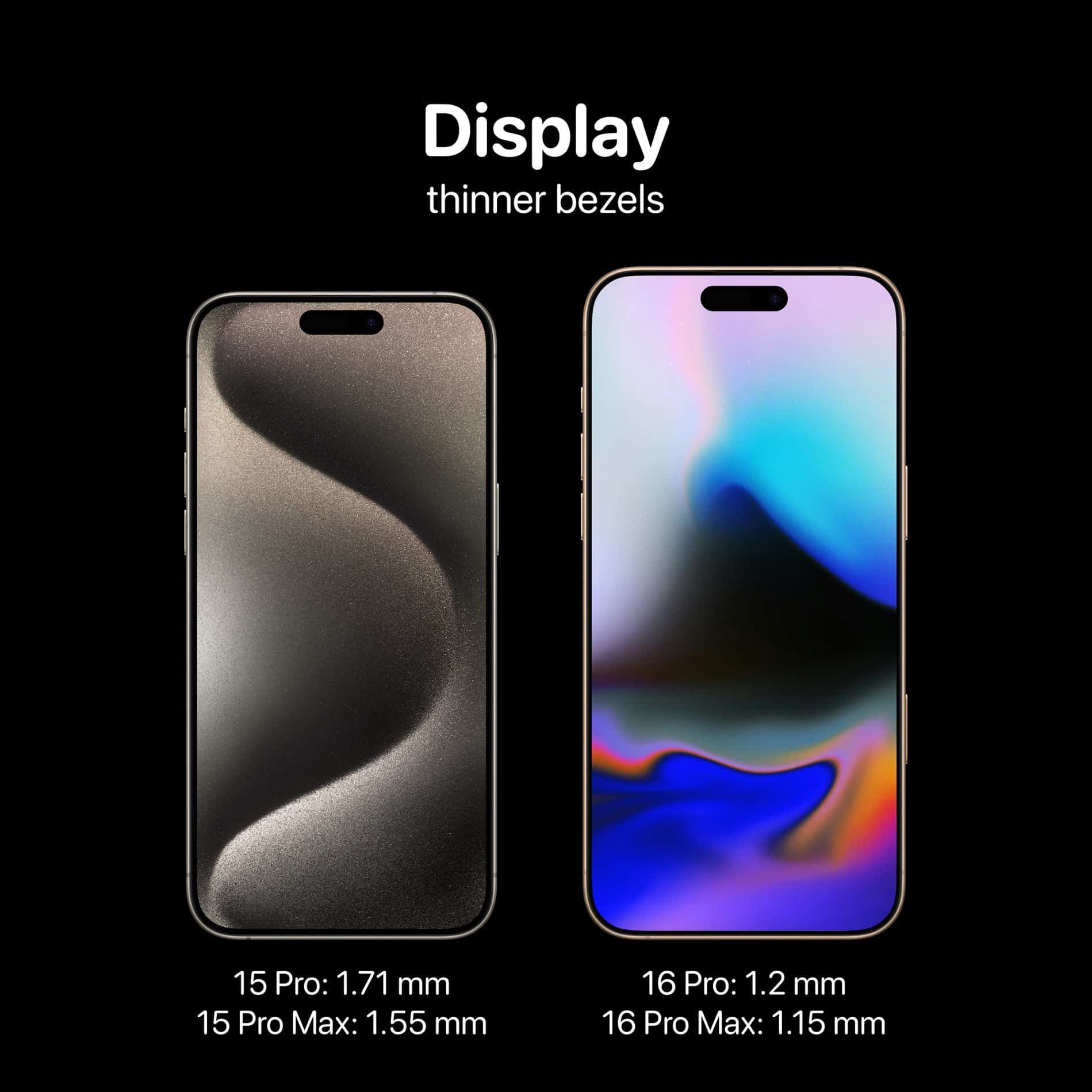 iPhone 15 Pro’da 6.1 inç, 15 Pro Max’te ise 6.7 inç ekran var. Bu değerler 16 Pro ve 16 Pro Max’te 6.3 ve 6.9 inç boyutlara çıkacak. 15 Pro modelinde 1.7mm, 15 Pro Max’te ise 1.55mm olan çerçeveler, 16 Pro’da 1.2mm’ye, 16 Pro Max’te ise 1.5mm’ye incelecek. Son olarak 16 Pro ve 16 Pro Max’te daha parlak olan MLA OLED ekran kullanılacak.