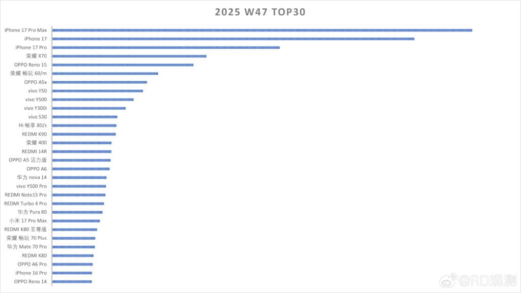 Çinli blog yazarı RD Observation, 47. haftaya (17–23 Kasım) ait akıllı telefon satış verilerini paylaştı. Ekim ayındaki lansmanların ve 11/11 indirimlerinin etkisiyle yaşanan artışın ardından satışlar sert bir düşüş yaşayarak %20 geriledi. Kalan satışların marka bazında dağılımı ise şöyle: