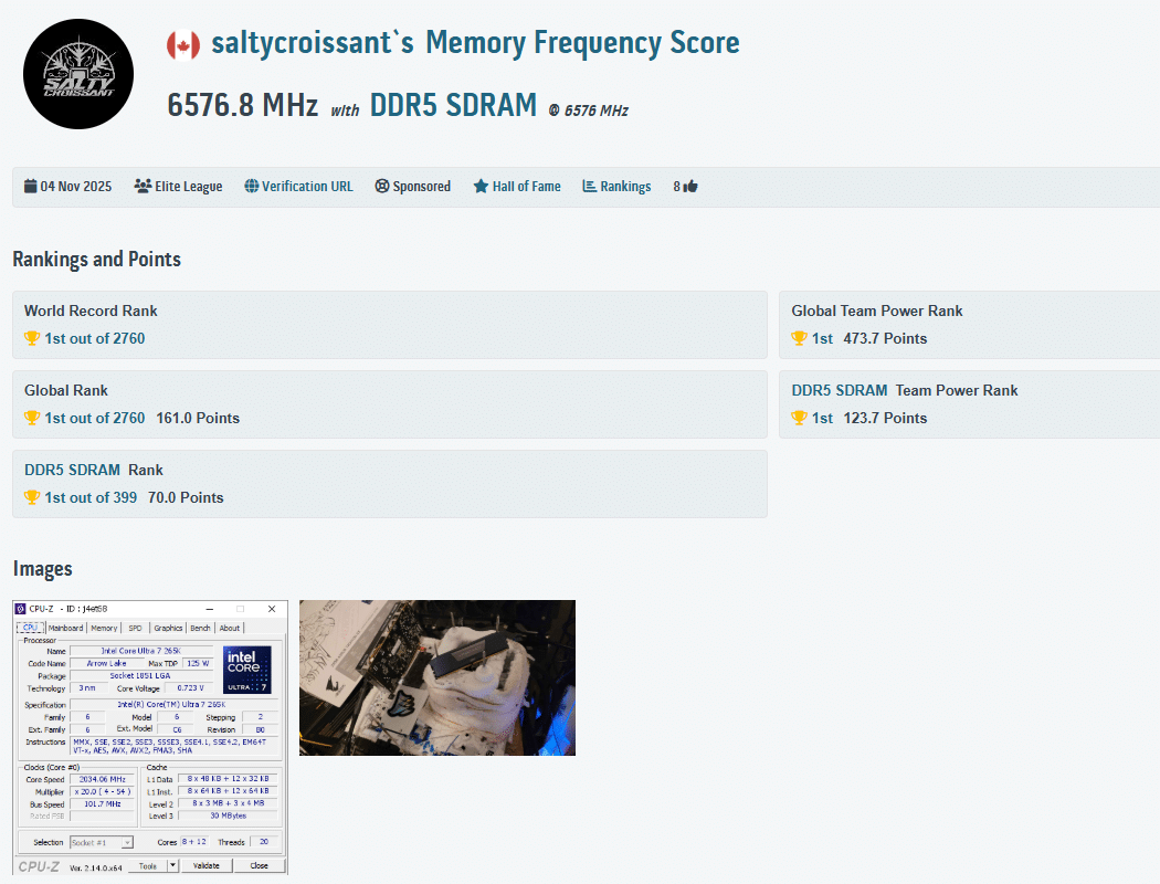 Ancak asıl şok edici gelişme bugün yaşandı. Hız aşırtma uzmanı Saltycroissant, bu iki rekoru da altüst ederek çıtayı bambaşka bir seviyeye taşıdı. GIGABYTE Z890 AORUS Tachyon ICE anakart ve Intel Core Ultra 7 265K işlemciden oluşan özel bir kurulum kullanan Saltycroissant, 24 GB’lık DDR5 Corsair Vengeance bellek çubuğu ile inanılması güç bir hıza ulaştı: 13.153 MT/sn!