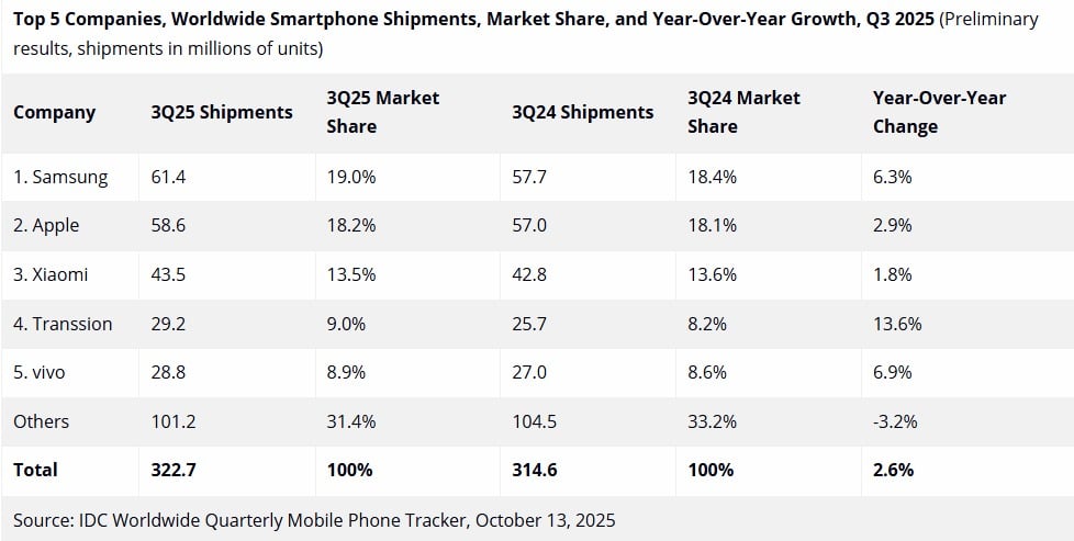 Uluslararası Veri Şirketi (IDC), 2025’in üçüncü çeyreğine ait Dünya Akıllı Telefon Pazarı Takip Raporunu yayınladı. Rapora göre, küresel akıllı telefon sevkiyatları yıllık bazda %2,6 artarak 322,7 milyon adede ulaştı. Uzmanlar, bu büyüme trendini yenilikçi form faktörlere ve daha erişilebilir fiyatlı yapay zeka destekli akıllı telefonların hızla artan popülaritesine bağlıyor. İşte en çok telefon satan markalar!