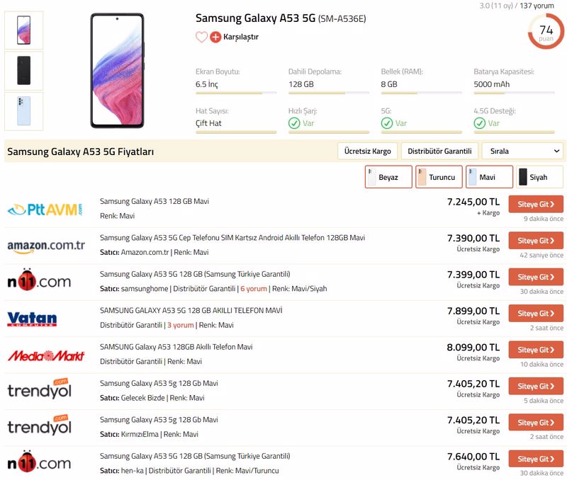Telefonun fiyatını son kontrol ettiğimizde 7.245 TL seviyelerine kadar gerildiğini gördük. Kısa süre içerisinde yaklaşık 1.500 TL’lik indirim hiç de fena görünmüyor. Giriş ve orta segment telefonların mevcut fiyatları göz önüne alındığında IP67 sertifikası, 120Hz AMOLED ekranı, stereo hoparlör ve OIS destekli arka kamerasıyla Galaxy A53 5G’nin indirimli fiyatı fazlasıyla rekabetçi görünüyor.