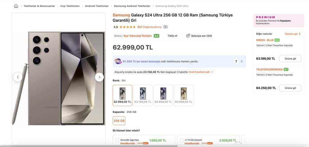 Galaxy S24 Ultra halihazırda Samsung‘un resmi sitesinde S25 Ultra ile aynı fiyattan satışta ancak bunun geçici olduğunu ve markanın çok yakında geçen yılın tepe modelini satıştan kaldıracağını düşünüyoruz. Farklı perakendecilere göz attığımızda ise S24 Ultra’nın fiyatının hangi seviyelerde olduğunu görebiliyoruz. Telefonun 12GB RAM + 256GB versiyonu halihazırda Hepsiburada.com’da 62.999 TL‘den satılmakta. Söz konusu 512GB’lık model olduğunda ise fiyat 71.499 TL‘ye çıkıyor.