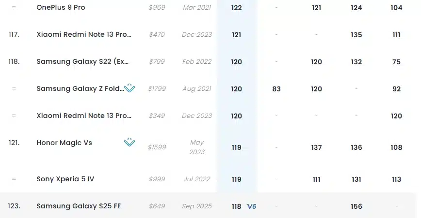 Samsung’un Galaxy S25 FE modeli, DxOMark kamera testlerinde zayıf bir sonuç alarak hem daha eski hem de daha uygun fiyatlı birçok telefonun gerisinde yer aldı. DxOMark verilerine göre Galaxy S25 FE, kamera testlerinden 118 puan alarak küresel sıralamada 123. sıraya yerleşti. Bu skor, telefonu iPhone 12 Pro Max, iPhone 13, 2022 çıkışlı Google Pixel 6a ve birkaç yıl öncesinin modellerinin bile gerisine düşürüyor.