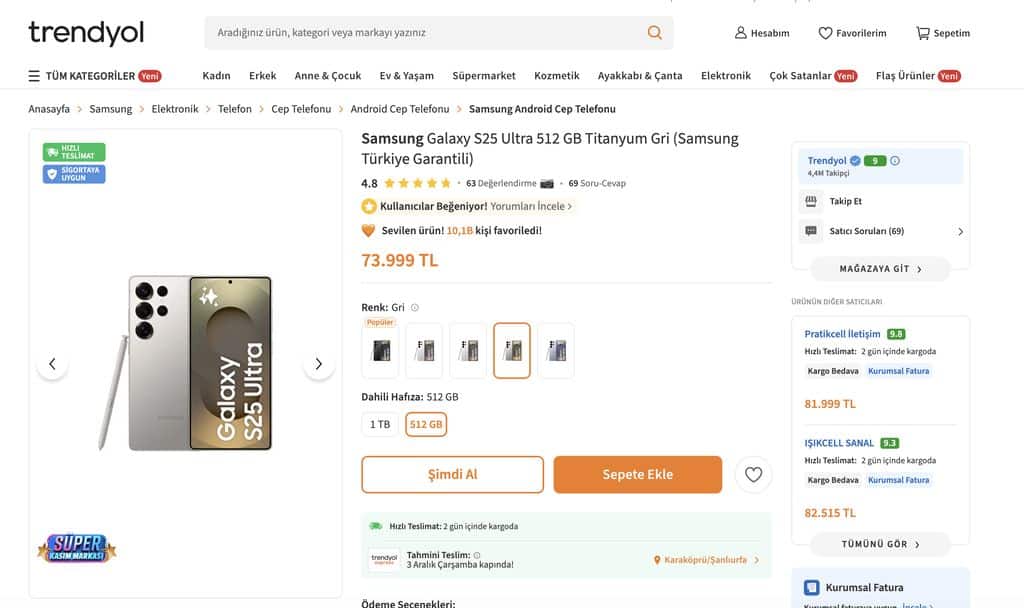 Galaxy S25 Ultra’nın 256 GB, 512 GB ve 1 TB versiyonları halihazırda Samsung’un resmi sitesinde 93.499 TL, 101.499 TL ve 111.499 TL’den satılmakta. Ancak bu telefonu şimdi farklı perakendecilerde çok daha düşük fiyata satın almanız mümkün. Hatta 512 GB seçeneğinde neredeyse 30.000 TL’yi bulan bir indirim söz konusu. Telefonun 512 GB versiyonu şimdi Trendyol’da (satıcı Trendyol) 73.999 TL’ye geriliyor. Eğer şu sıralar amiral gemisi bir telefon satın almayı planlıyorsanız S25 Ultra bu fiyatı ile fazlasıyla cazip hale gelmiş durumda.