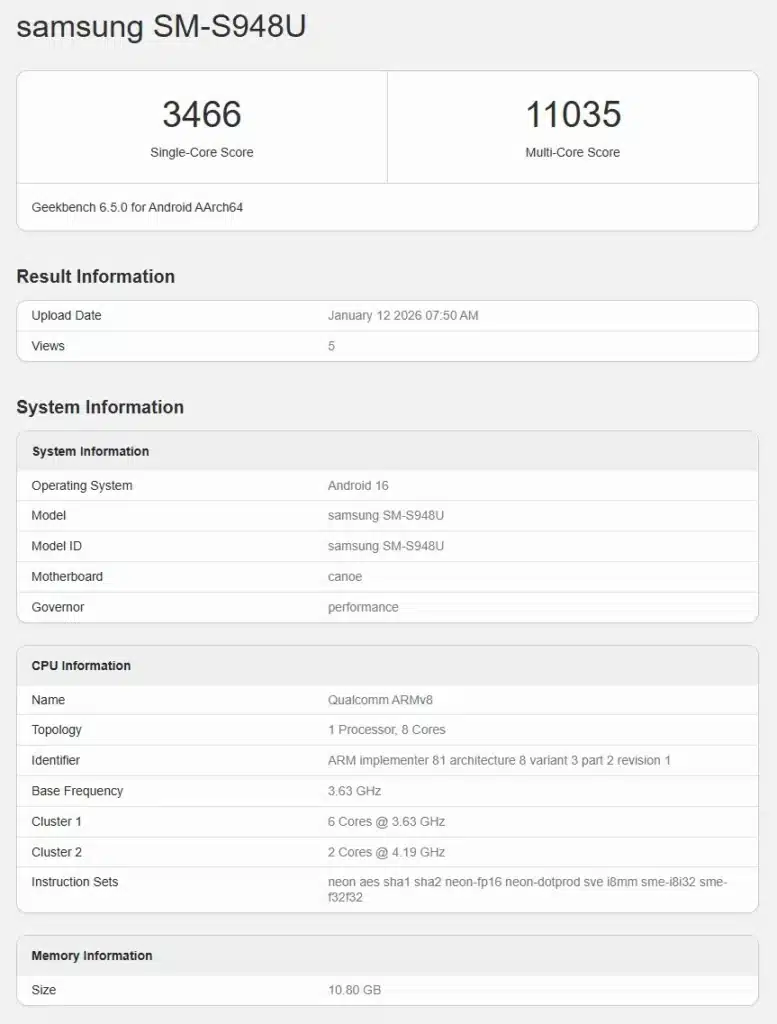 Geekbench listelerinde işlemci adı açıkça yazmıyor ancak CPU ve GPU verileri, her iki telefonun da Galaxy için özelleştirilmiş Snapdragon 8 Elite Gen 5 yonga setiyle çalıştığını ortaya koyuyor. Bu işlemci, 4,19 GHz hızında iki çekirdek, 3,55 GHz hızında altı çekirdek ve Adreno 840 grafik birimini içeriyor. Standart Snapdragon 8 Elite Gen 5’e kıyasla saat hızlarının biraz daha düşük olduğu görülüyor.