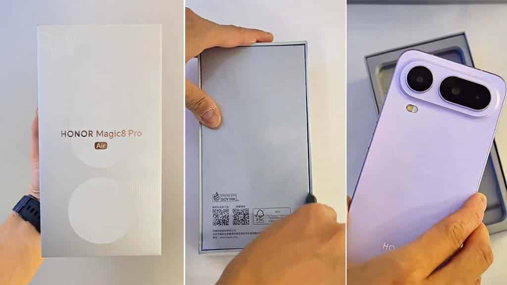 Cihaz, üzerinde Honor Magic 8 Pro Air yazısı bulunan beyaz bir kutu ile geliyor. Iceuniverse aracılığıyla paylaşılan videoda telefonun mor renkli bir seçeneği görülüyor. Arka tarafta geniş açılı, ultra geniş açılı ve telefoto lenslerden oluşan üçlü kamera modülü yer alıyor. LED flaş ise bu kamera adasının hemen altında konumlandırılmış.