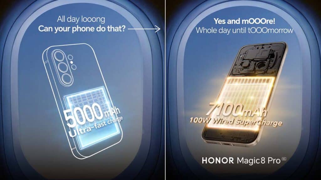 Paylaşılan gönderide iki farklı görsel yer aldı. İlk görselde Galaxy S26 Ultra’nın 5000 mAh bataryasını vurgulayan beyaz bir çizim bulunuyor. Diğer görselde ise 7100 mAh bataryaya ve 100W kablolu süper şarj özelliğine sahip Honor Magic 8 Pro modeli gösteriliyor. Bu görsellerle şirket, cihazın uzun pil ömrüne dikkat çekiyor.