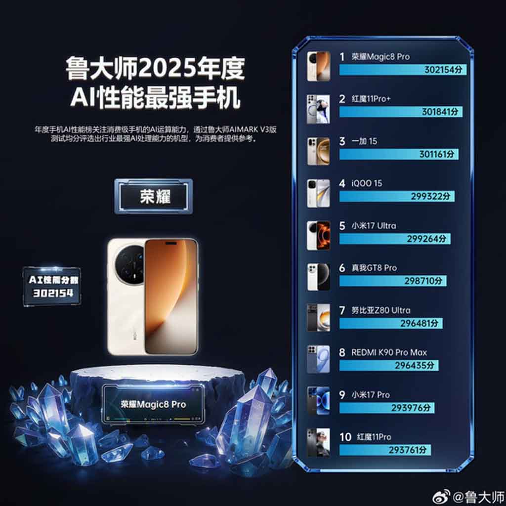 Honor Magic 8 Pro, yalnızca tasarım ve kamera özellikleriyle değil, yapay zeka performansıyla da öne çıkıyor. Son olarak “2025’in en güçlü yapay zekâ performansına sahip telefonları” listesinde en yüksek puanı alarak zirveye yerleşti. Master Lu, kısa süre önce 2025 yılının en güçlü yapay zeka destekli akıllı telefonlarını açıkladı. Değerlendirme, AIMARK V3 test standardına göre yapıldı ve ilk 10 model listelendi. Magic 8 Pro, 302.154 puan alarak listenin ilk sırasında yer aldı ve 2025’in en güçlü yapay zeka telefonu unvanını kazandı.