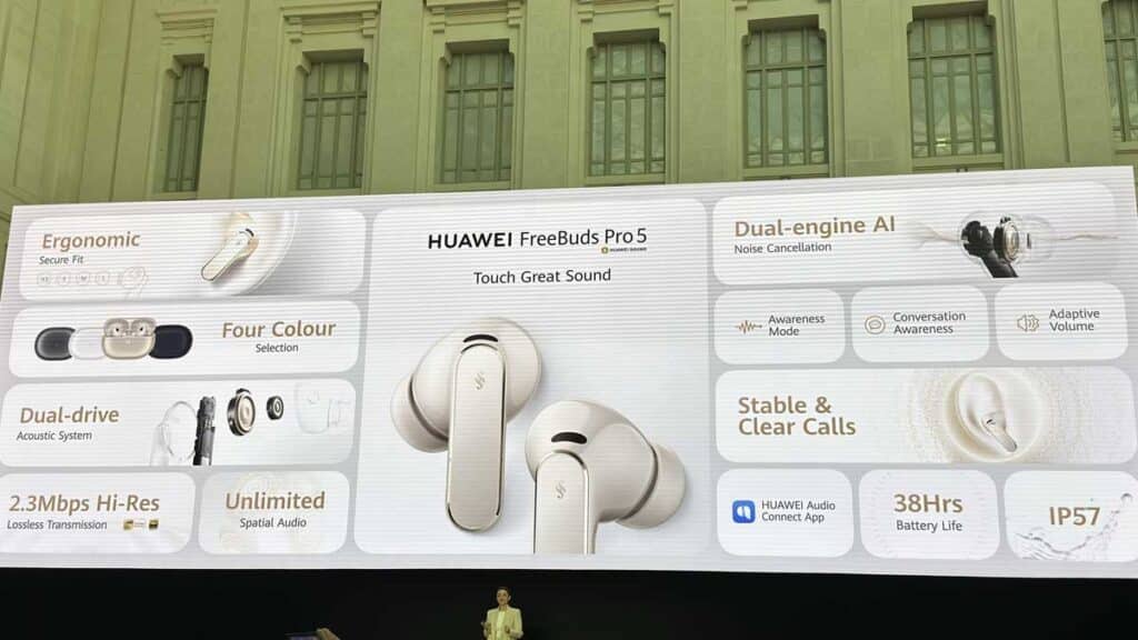 FreeBuds Pro 5, çift üniteli ve çift kanallı aktif gürültü engelleme (ANC) sistemiyle geliyor. Sistem, ters ses dalgaları üreten akustik birimlerle birlikte çalışarak çevresel gürültüyü azaltıyor. Kulaklıkta 10 Hz’e kadar inebilen ultra doğrusal çift manyetik devreli bas ünitesi ve 48 kHz’e kadar çıkan ultra ince mikro düzlemsel tiz hoparlör bulunuyor.