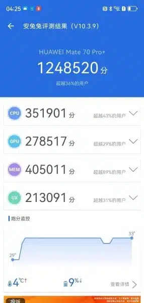 Grafik işleme birimi (GPU) de Maleoon 920 olarak adlandırılan şirket içi bir tasarım. Kirin 9010’un Maleoon 910 GPU’su 750 MHz’ye ulaşırken, Maleoon 920 GPU’da bu hız 840 MHz’ye çıkabiliyor. Huawei Mate 70 Pro Plus yeni işlemciyle birlikte AnTuTu testinde toplamda 1.248.520 puan almayı başarıyor. Qualcomm ve MediaTek’in en son amiral gemisi yonga setlerinin elde ettiği puanlarla kıyaslandığında çok geride. Zira Snapdragon 8 Elite ve MediaTek Dimensity 9400 3 milyon baraşını aşmayı başarıyor.