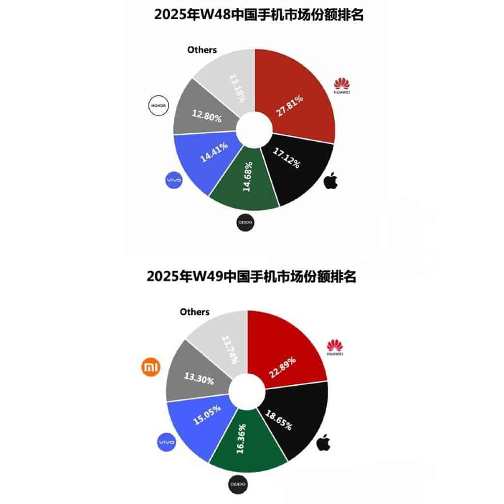 Verilere göre Huawei, 48. haftada %27,81, 49. haftada ise %22,89 pazar payına ulaştı. Böylece şirket, iki hafta üst üste Apple’ı geride bırakmış oldu.