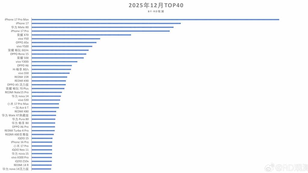 Huawei Mate 80, Aralık 2025’te Çin’in premium akıllı telefon pazarında en çok konuşulan modellerden biri oldu. Weibo’da paylaşılan bir pazar analizine göre cihaz, en iyi üç premium telefon arasına girmeyi başardı. RDObservation tarafından yayımlanan tabloya göre Aralık 2025 döneminde premium segmentte iPhone 17 Pro Max ve iPhone 17 ilk iki sırayı alırken, Huawei Mate 80’in standart modeli üçüncü sırada yer aldı. Huawei, güçlü rakiplere rağmen amiral gemisi satışlarında üst sıralardaki yerini korumayı başardı.