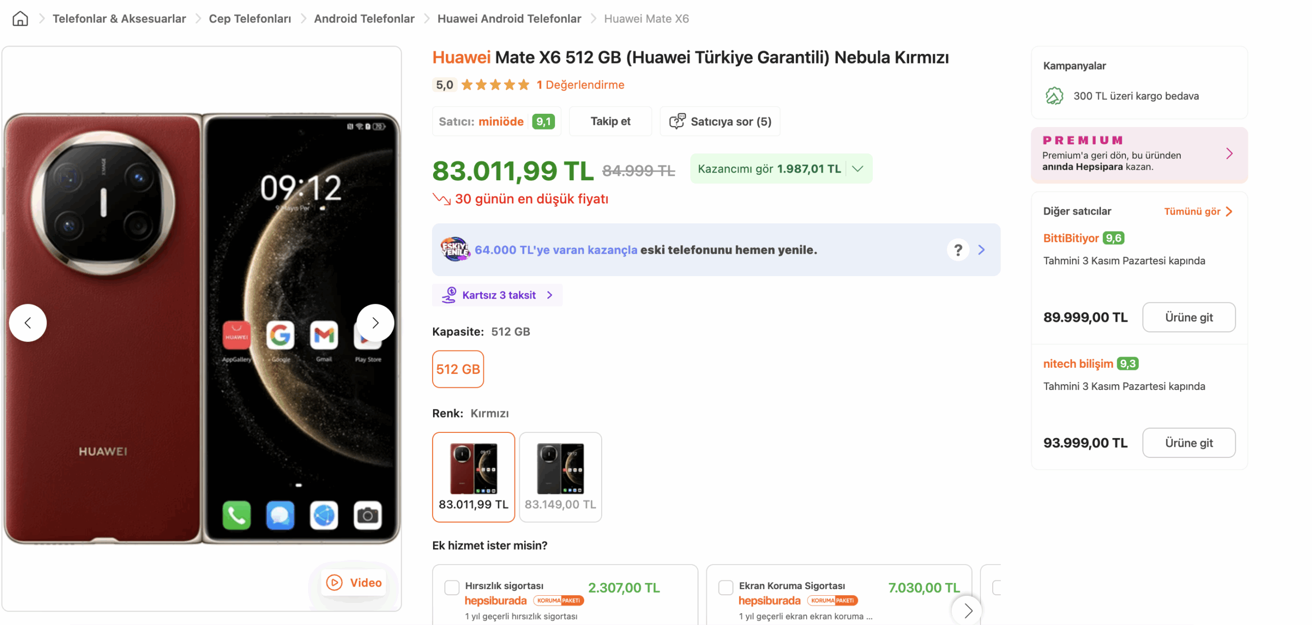 Türkiye’de katlanabilir telefon pazarının iddialı oyuncularından biri olan Huawei Mate X6, özellikleriyle olduğu kadar fiyatıyla da adından söz ettiriyor. Ancak son günlerde ortaya çıkan büyük fiyat farkı, potansiyel alıcıları şaşkına çevirdi. Huawei’nin resmi online mağazasında yaklaşık 115.000 TL, Mediamarkt’te ise 100 bin TL seviyelerinde listelenen cihaz, önde gelen e-ticaret platformlarından Hepsiburada‘da, farklı satıcılar aracılığıyla 83.000 TL civarında bir fiyatla alıcı buluyor.