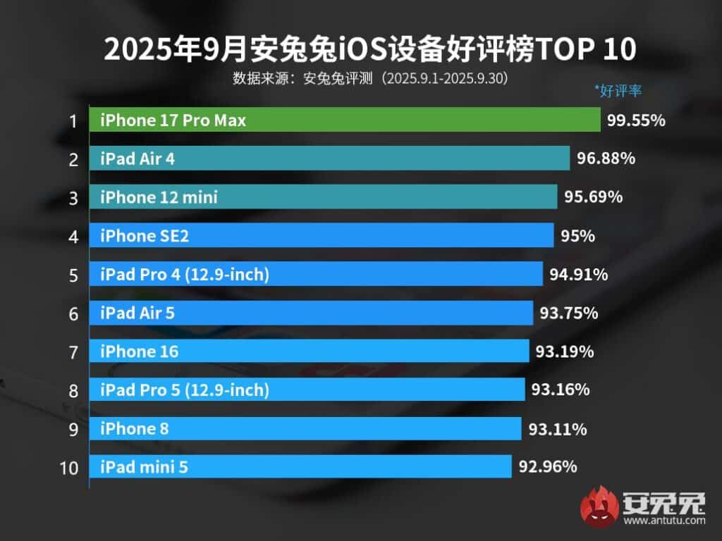 AnTuTu tarafından yayınlanan son kullanıcı memnuniyeti raporuna göre iPhone 17 Pro Max, Apple ekosistemindeki en memnun edici cihaz oldu. Kullanıcıların %99,55’i akıllı telefonlarından “çok memnun” olduklarını belirtti. Böylece iPhone 17 Pro Max, iOS cihazları arasında birinci sıraya yerleşti.