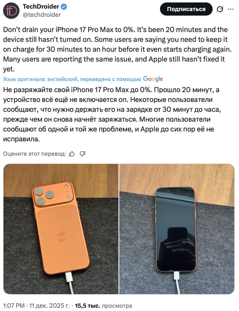Söz konusu hata TechDroider tarafından da doğrulandı. iPhone 17 Pro Max’in pili tamamen tükendiğinde ve telefon kapandığında, şarj kablosu takılsa bile cihaz tepki vermiyor. Telefon açılmıyor ve ekranda herhangi bir şarj animasyonu görünmüyor.