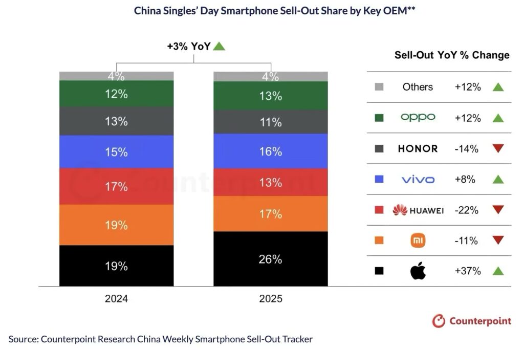 Apple’ın daha yüksek fiyatlı iPhone 17 Pro modelleri de etkileyici bir performans gösterdi. Şirketin satış dönemindeki pazar payı geçen yılki %19’dan %26’ya yükselirken, toplam satışları yıllık bazda %37 arttı. Karşılaştırma için, aynı dönemde OPPO %12, vivo ise %8 artış kaydetti. Diğer büyük üreticiler ise düşüş yaşadı.