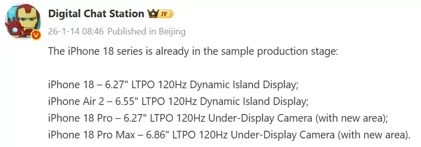 Sızıntılara göre tüm iPhone 18 modelleri şu anda şirket içinde test ediliyor. Standart iPhone 18’in, 120 Hz yenileme hızına sahip 6,27 inç LTPO OLED bir ekranla geleceği ve mevcut Dynamic Island tasarımını koruyacağı belirtiliyor. iPhone Air 2’nin ise 6,55 inç boyutunda, yine 120 Hz LTPO teknolojisine sahip bir ekran kullanacağı ve daha ince, daha hafif bir gövdeye rağmen tanıdık bir ön tasarımı sürdüreceği ifade ediliyor.