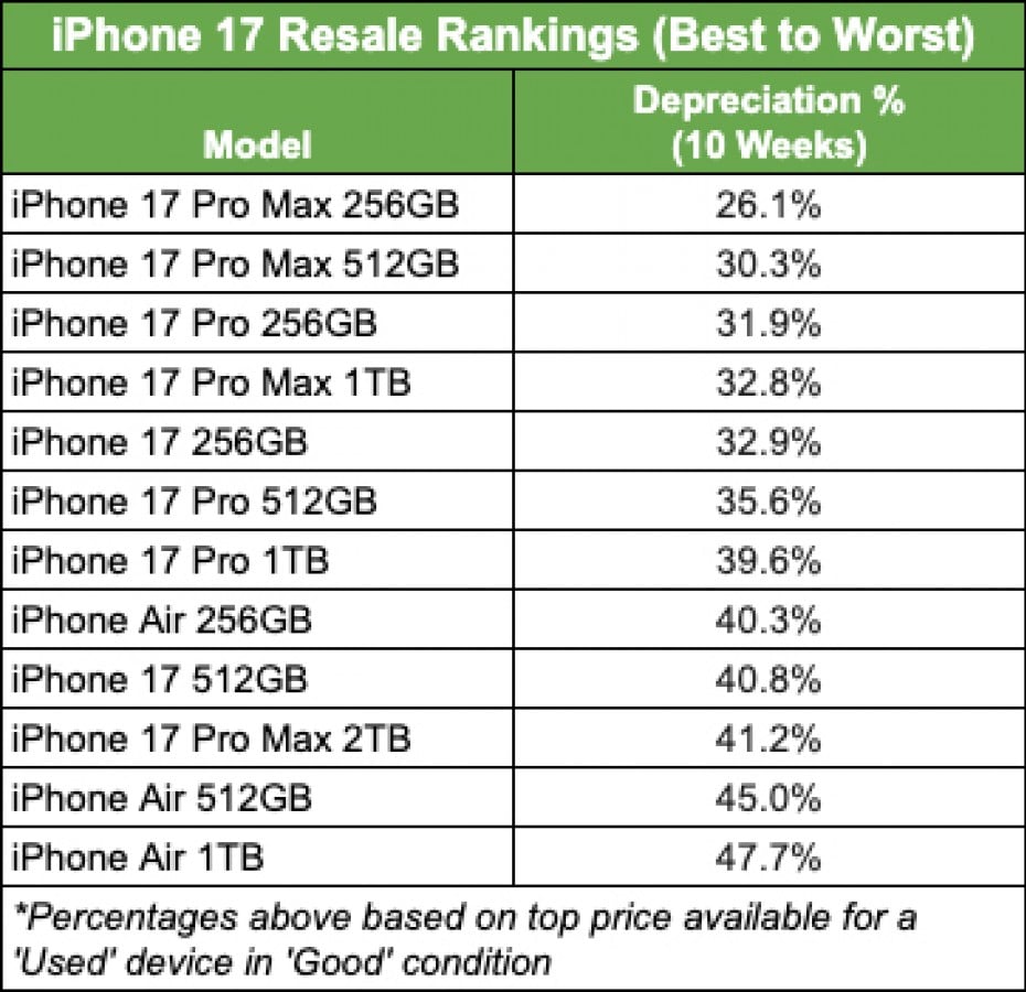 iPhone 17 serisinin geri kalanı, on haftalık dönemde ortalama %34,6 değer kaybıyla yeniden satış açısından seleflerinden daha iyi performans gösteriyor. 256 GB iPhone 17 Pro Max, ilk değerinin yalnızca %26,1’ini kaybederek en iyi performansı sergiliyor. 256 GB iPhone 17 Pro aynı dönemde %32 değer kaybederken, temel 256 GB iPhone 17 de benzer şekilde %33 düşüş yaşıyor.