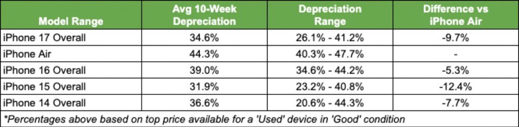 iPhone Air, satışlarda büyük bir fiyaskoya dönüşüyor ve bu durum yeniden satış değerine de yansıyor. SellCell’in yeni raporu, iPhone 17 serisinin değer kaybını on haftalık bir süre boyunca, ABD merkezli 40’tan fazla geri alım şirketinden alınan takas fiyatı verilerine dayanarak analiz etti. Verilere göre Air, depolama alanına bağlı olarak ilk değerinin %40,3 ila %47,7’sini kaybetti.