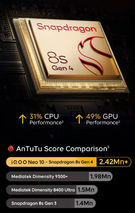 Hem Amazon Hindistan hem de iQOO Hindistan’ın resmi web sitelerinde oluşturulan özel sayfalar aracılığıyla telefonun bazı önemli özellikleri de gün yüzüne çıktı. Buna göre iQOO Neo 10, Snapdragon 8s Gen 4 platformu sayesinde kendi segmentinde “en hızlı telefon” iddiasını taşıyor. Şirket, yeni yonga setinin CPU performansında %31 ve GPU performansında ise geçen yılın modeli olan Snapdragon 8s Gen 3’e kıyasla %49’luk bir artış sağladığını belirtiyor. Telefonun AnTuTu testinde 2,42 milyonun üzerinde bir skor elde ettiği ve bu sonuçla Dimensity 9300+, Dimensity 8400 Ultra ve Snapdragon 8s Gen 3 gibi güçlü rakiplerini geride bıraktığı vurgulanıyor.