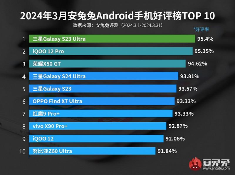 Sıralamada birinci sırada yine Samsung Galaxy S23 Ultra yer aldı. Akıllı telefon %95,4 oranında bir memnuniyet oranına sahip. İkinci sırada ise %95,35 ile iQOO 12 Pro yer alıyor. Listenin üçüncü sırasında ise sürpriz bir model olan Honor X50 GT‘yi görüyoruz. AnTuTu, bu model için şu değerlendirmede bulunuyor: