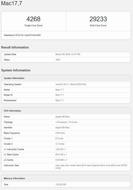 Geekbench, yeni MacBook Pro modelinin Apple M5 Max işlemcili versiyonuna ait performans test sonuçlarını paylaştı. Test sonuçları, yeni işlemcinin önceki nesle kıyasla ne kadar güçlü olduğunu ortaya koyuyor.