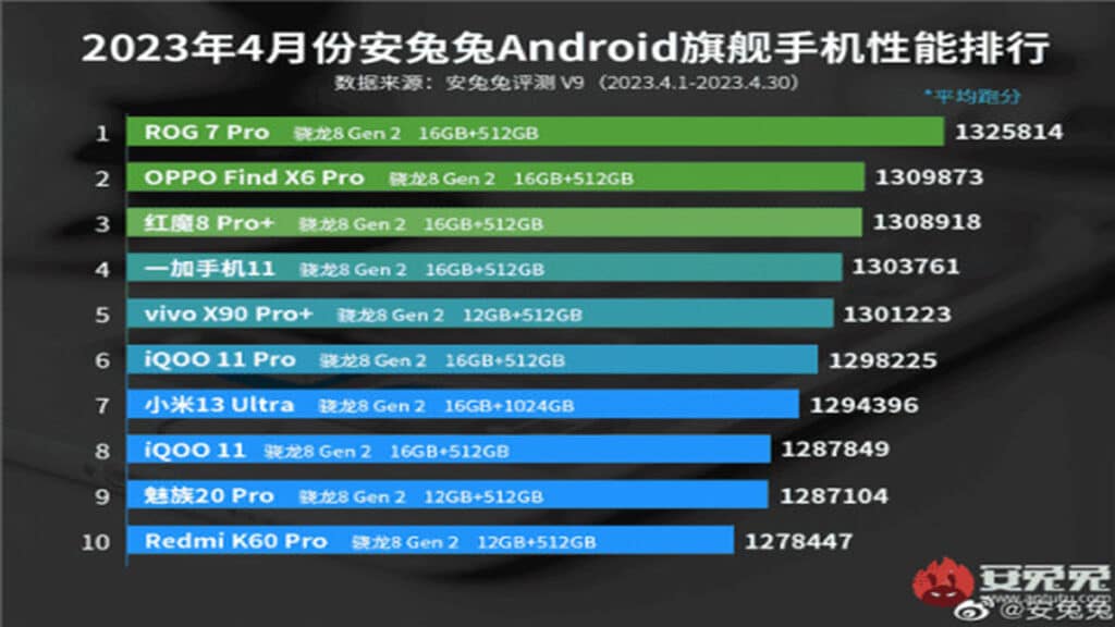 2023 Nisan ayı itibariyle akıllı telefon pazarının performans lideri 1.325.814 puan alan Asus Rog Phone 7 Pro oldu. Onu OPPO Find X6 Pro (1.309.873) ve Nubia Red Magic 8 Pro+ (1.308.918) takip ediyor. Listenin dördüncü sırasında OnePlus 11 (1.303.761) yer alıyor ve Vivo X90 Pro+ 1.301.223 puanla ilk beşi kapatıyor.