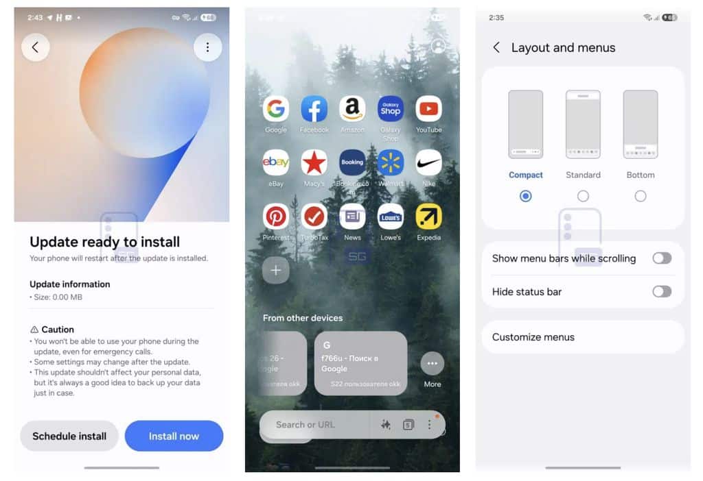 One UI 9’daki en dikkat çekici yenilik ise Samsung Internet tarayıcısında görülen “Yapay Zekaya Sor” düğmesi olabilir. İlk sürümlerde ayrıca “Kompakt” adlı yeni bir düzen seçeneği yer alıyor. Bu mod, arama çubuğu, son sekmeler ve menü erişimini alt bölümde yeniden tasarlanan bir çubukta bir araya getiriyor.