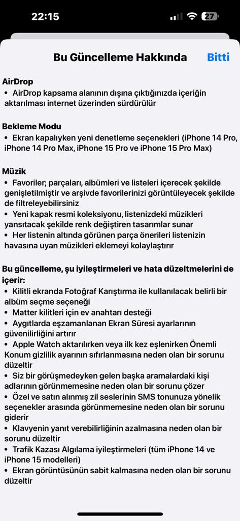 - Trafik Kazası Algılama iyileştirmeleri (tüm iPhone 14 ve iPhone 15 modelleri)