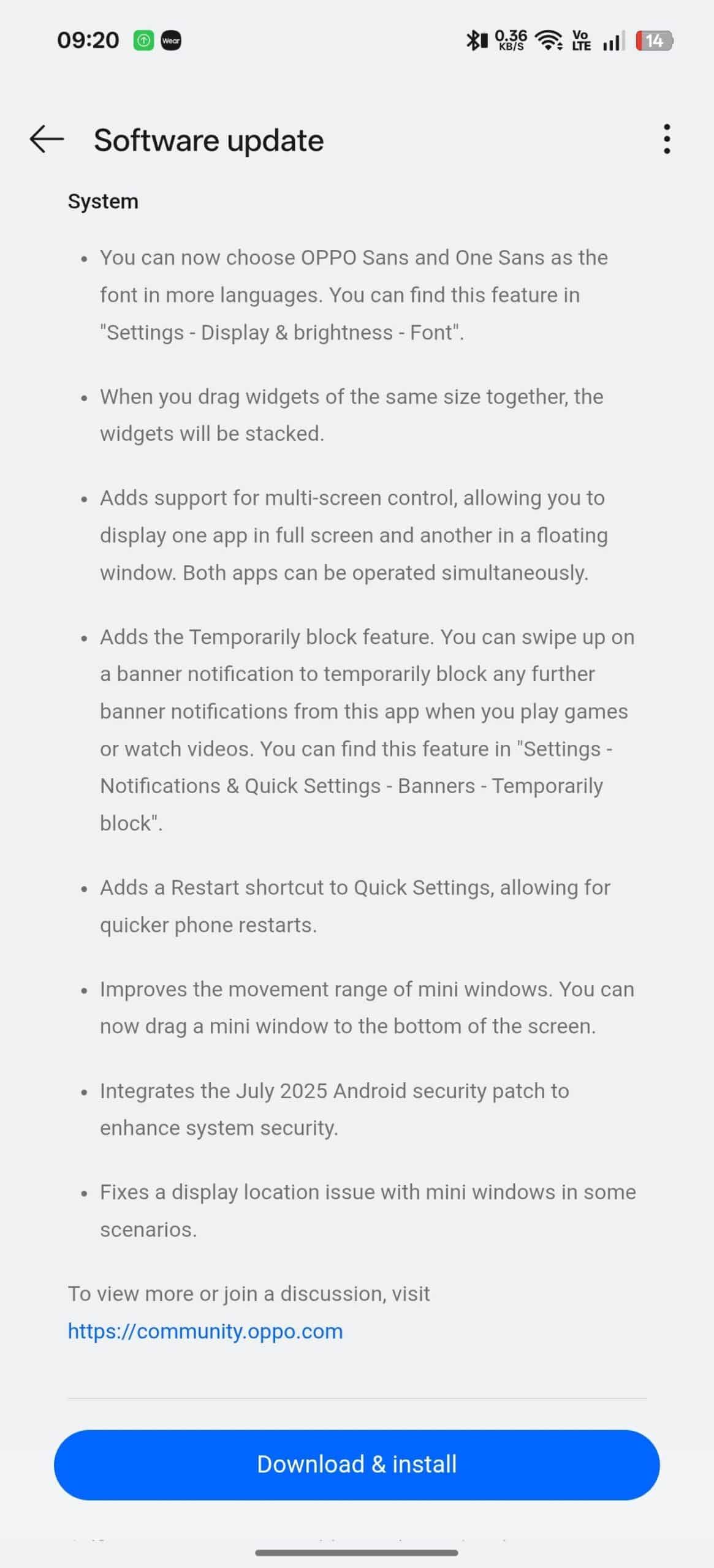 Genel sistem değişiklikleri arasında, OPPO Sans ve One Sans yazı tipleri arasında daha fazla dilde seçim yapma olanağı yer alıyor. Aynı boyuttaki widget’lar artık üst üste yerleştirilebiliyor. Çoklu ekran kontrolü, bir uygulamanın tam ekran, diğerinin ise yüzen pencerede aynı anda çalışmasına izin veriyor. Oyun oynarken veya video izlerken banner bildirimlerini geçici olarak engellemek için yeni bir seçenek de eklendi.