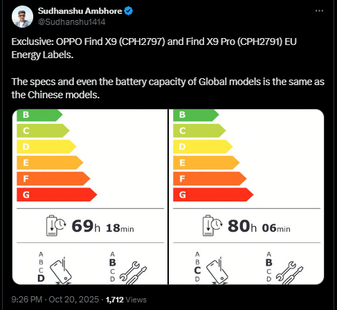 Her iki modelde de 80W kablolu ve 50W kablosuz hızlı şarj desteği bulunuyor, bu da uzun kullanım süresiyle birlikte hızlı dolum avantajı sunuyor. İddiayı destekleyen bir diğer detay, Find X9 (CPH2797) ve Find X9 Pro (CPH2791) modellerinin AB Enerji Etiketi listelerinde görünmesi oldu.