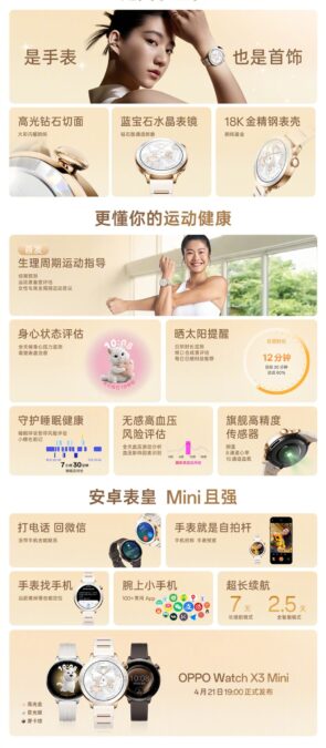 OPPO, Watch X3 Mini’yi 21 Nisan’da kendi ülkesinde küresel olarak piyasaya sürmeye hazırlanıyor. Şirket, bu ürünü öncelikle bir mücevher parçası, ikinci olarak da bir akıllı saat olarak konumlandırıyor, bu da bu alandaki çoğu giyilebilir cihaza kıyasla biraz farklı bir yaklaşım.