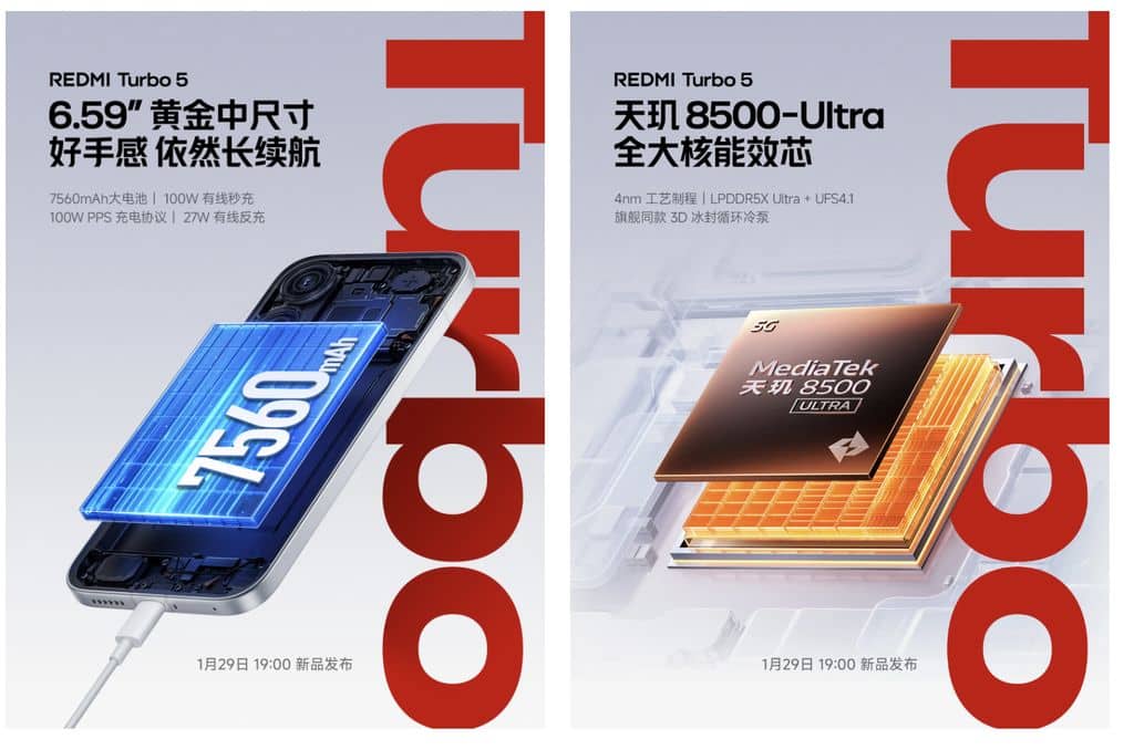 Redmi, kısa süre önce Turbo 5 Max’in özelliklerini paylaşmasının ardından şimdi de standart Redmi Turbo 5 modelinin önemli detaylarını resmi olarak açıkladı. Yayınlanan posterlerle birlikte ekran, pil, şarj ve işlemci bilgileri netleşti.