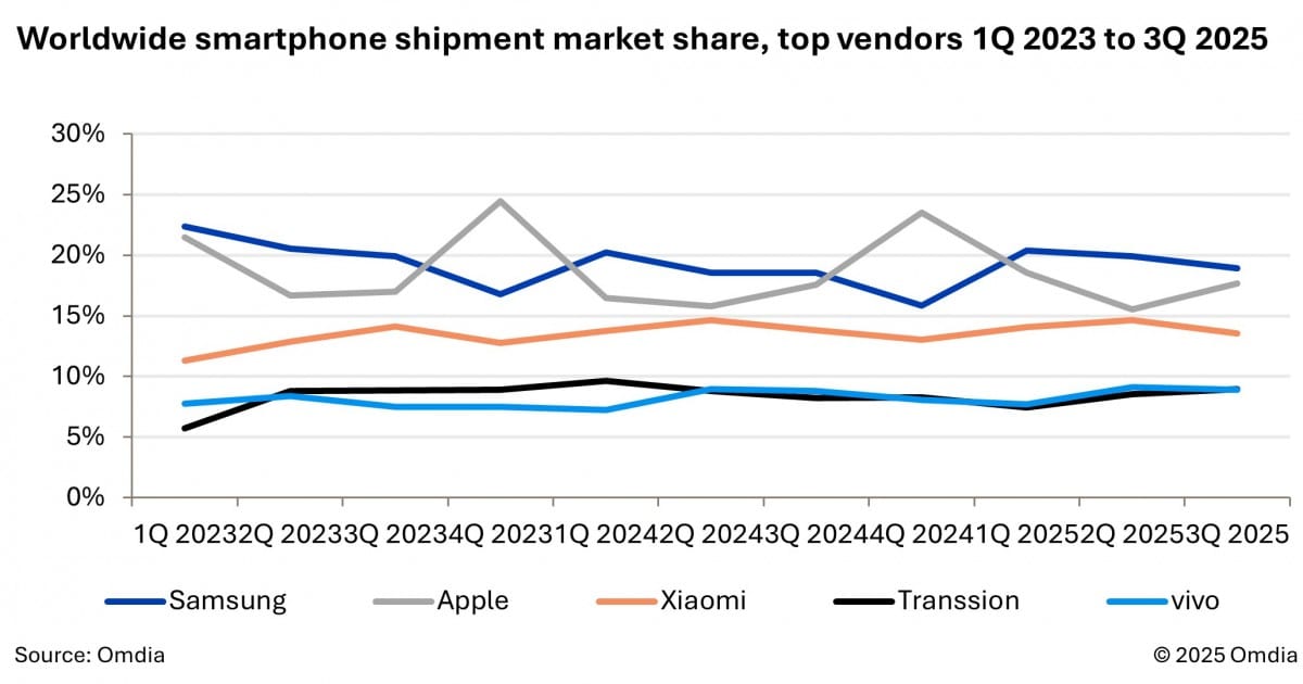 İkinci sırada, 56,5 milyon sevkiyat ve %18 pazar payı ile Apple yer aldı. Cupertino merkezli şirket, bir önceki yıla göre %4 büyürken, özellikle baz modeli iPhone 17‘nin “iyileştirilmiş değer önerisi” sayesinde lansman beklentilerini aştığı belirtiliyor.