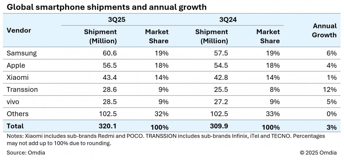 Küresel akıllı telefon pazarı, üçüncü çeyrekte yıllık bazda %3 artışla 320,1 milyon adet sevkiyat gerçekleştirdi. Pazarın en hızlı büyüyen oyuncusu ise, Infinix, iTel ve Tecno markalarının sahibi olan Transsion oldu. Şirket, 28,6 milyon sevkiyat ve %9 pay ile beşinci sırada yer alırken, yıllık bazda %12’lik rekor bir büyüme kaydetti.