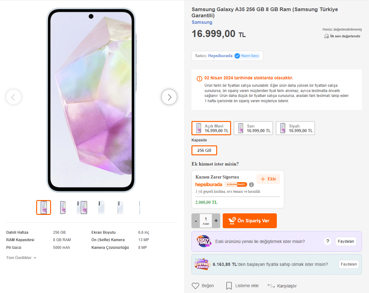 Ayrıca telefonları Hepsiburada Limiti sayesinde peşin fiyatına 3 taksitle satın alabileceksiniz. A35 5G modeli 2 Nisan tarihinde stoklarda olacak.