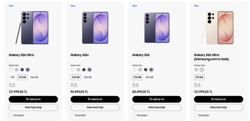 Samsung, Galaxy S26 serisini bugün Amerika’da düzenlediği etkinlikle tanıttı. Tanıtımın hemen ardından Galaxy S26 modelleri Türkiye’de de satış listesine eklendi. Seride Galaxy S26 Ultra, Galaxy S26+ ve Galaxy S26 modelleri yer alıyor. İşte merak edilen fiyatlar: