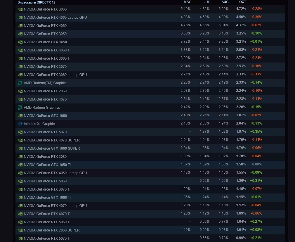 AMD cephesinde ise, Radeon RX 9070 gibi yeni kartlar sıralamalarda henüz yer almazken, Steam‘in “AMD Radeon™ Graphics” olarak sınıflandırdığı entegre ve genel AMD kartlarının payı %0,14 artışla %2,33’e yükselerek ilk 10’da kendine yer buldu.