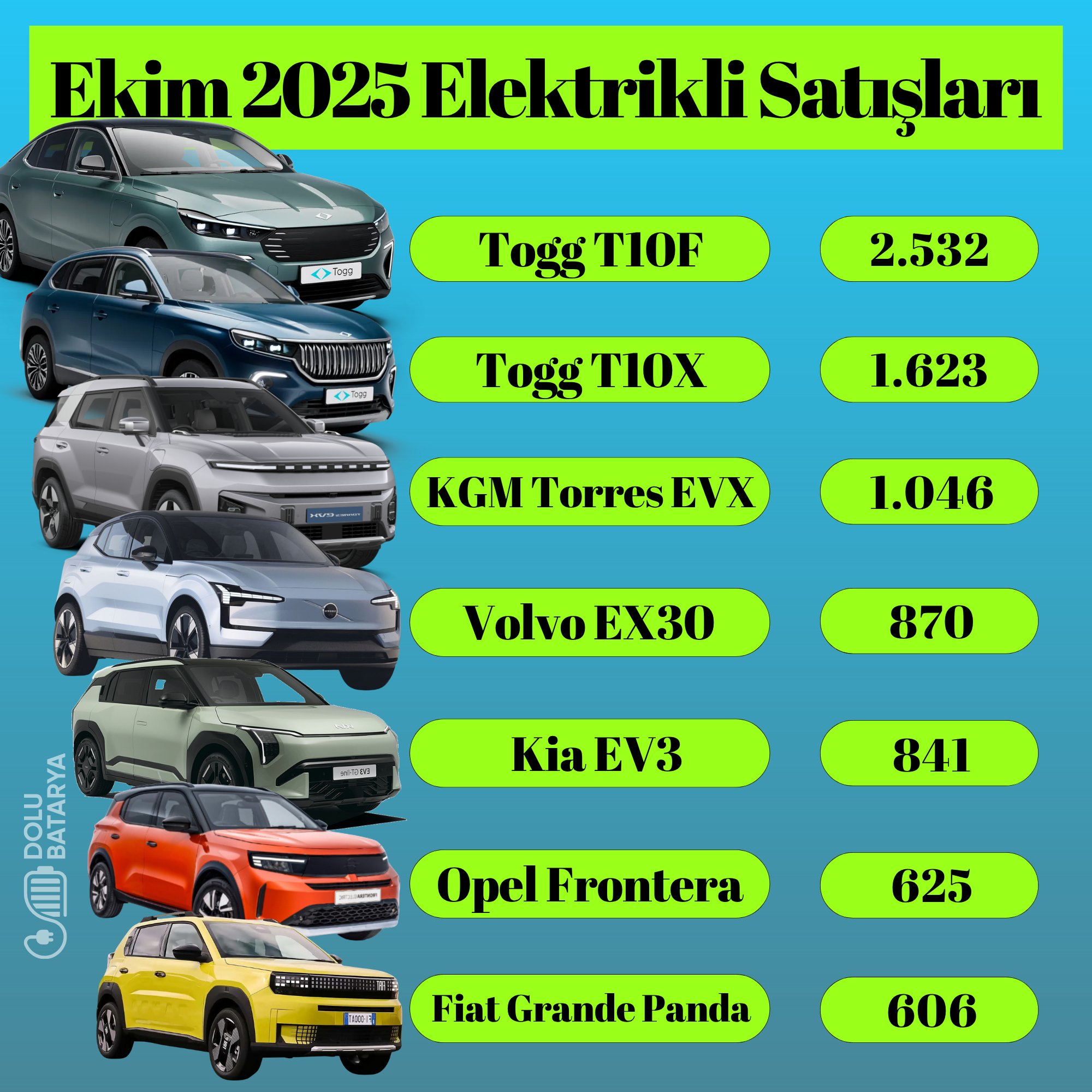 Ekim ayının en çok satan elektrikli araçları listesinde Togg’un iki modeli ilk iki sırayı paylaştı. Yeni Togg T10F modeli 2.532 adetle listenin başında yer alırken, onu 1.623 adetle Togg T10X izledi. Listenin devamında KGM Torres EVX, Volvo EX30 ve Kia EV3 gibi popüler modeller sıralandı.