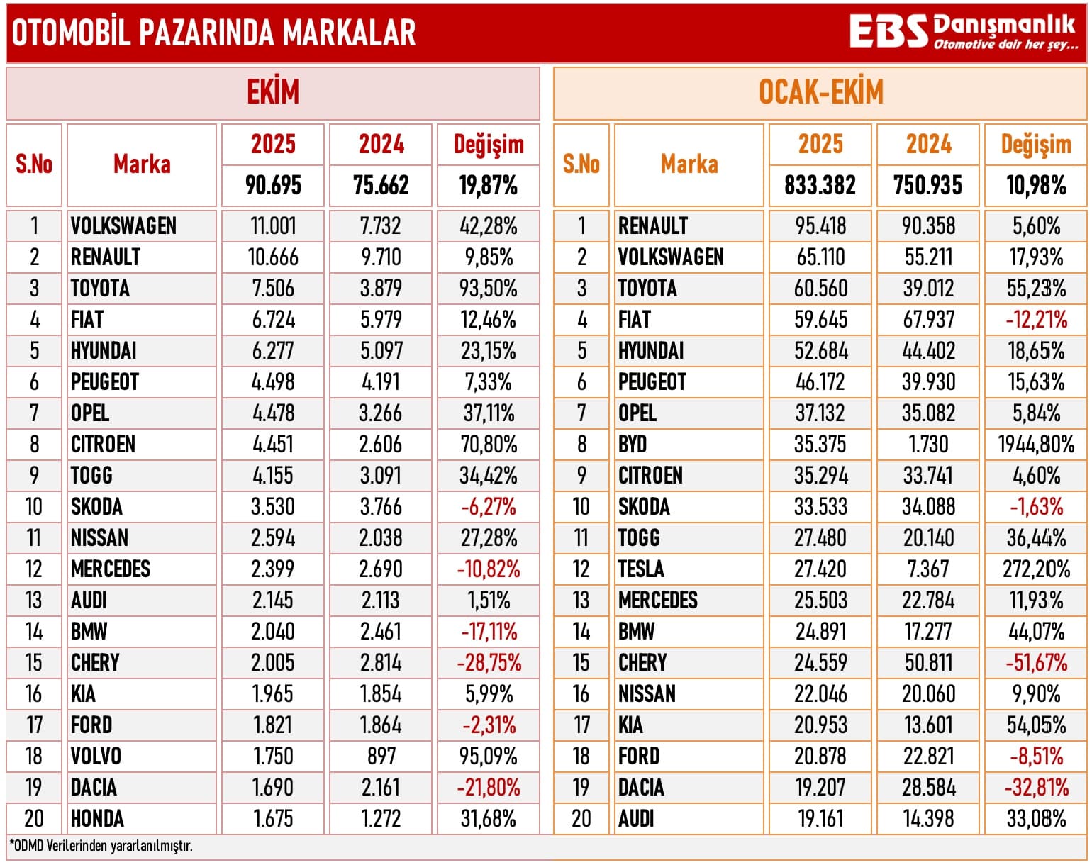 Ekim 2025’e ait Türkiye 0 km binek otomobil satış verileri açıklandı ve listedeki değişimler dikkat çekici bir pazar hareketliliğine işaret etti. Açıklanan verilere göre, Volkswagen uzun bir aradan sonra zirveye yerleşirken, yerli teknoloji markamız Togg, köklü rakiplerini geride bırakarak ilk 10’daki yerini sağlamlaştırdı. Yıllardır en çok satılan otomobil satan marka olan Fiat Toyotanın gerisine düştü.