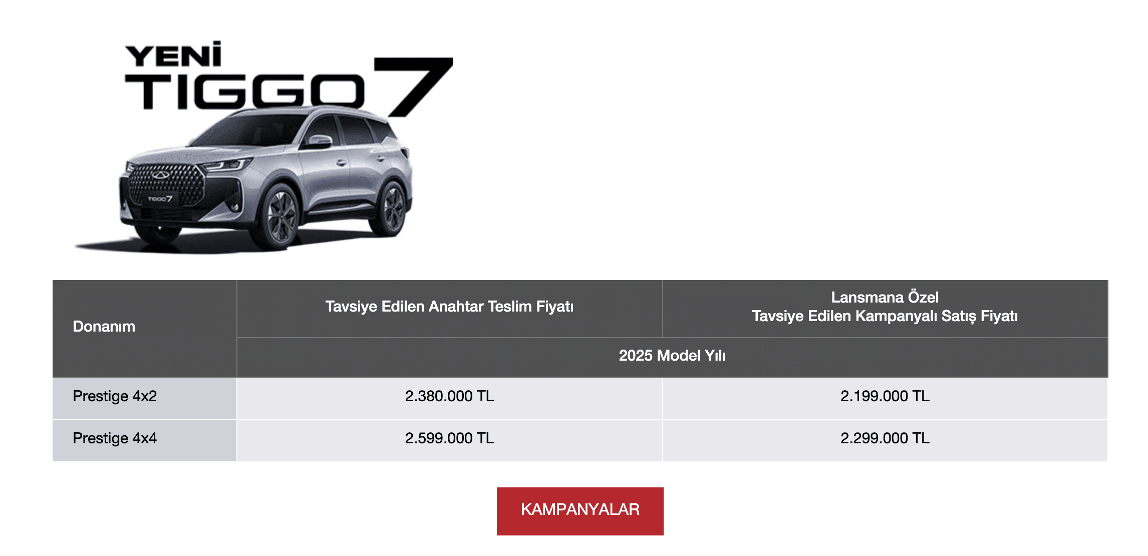 Yeni Chery TIGGO7, Prestige donanım seviyesinde, hem klasik 4×2 hem de yeni eklenen 4×4 versiyonlarıyla showroom’lardaki yerini aldı. Lansmana özel 2.199.000 TL’den başlayan fiyatlarla satışa sunulan model, ticari müşteriler için de cazip finansman seçenekleri sunuyor.