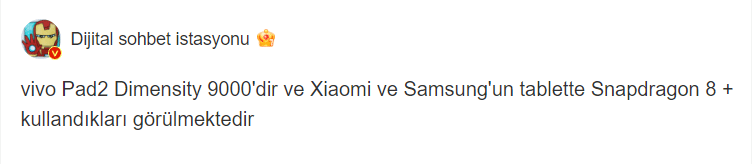 Nisan ayında piyasaya sürülmesi beklenen model hakkında son zamanlarda hem sızıntılar hem de söylentiler ortaya çıkıyor. Şimdi ise sızıntıları ile meşhur isim Dijital Sohbet İstasyonu tarafından Weibo’da yapmış olduğu açıklama ile yeni tabletin MediaTek’in amiral gemisi işlemcilerinden sayılabilecek Dimensity 9000 işlemcisi ile güçlendirileceğini belirtti. Ek olarak Qualcomm’un Snapdragon 8+ işlemcilerini sadece Xiaomi ve Samsung tabletlerinde gördüğümüzü açıklamasına ekliyor.