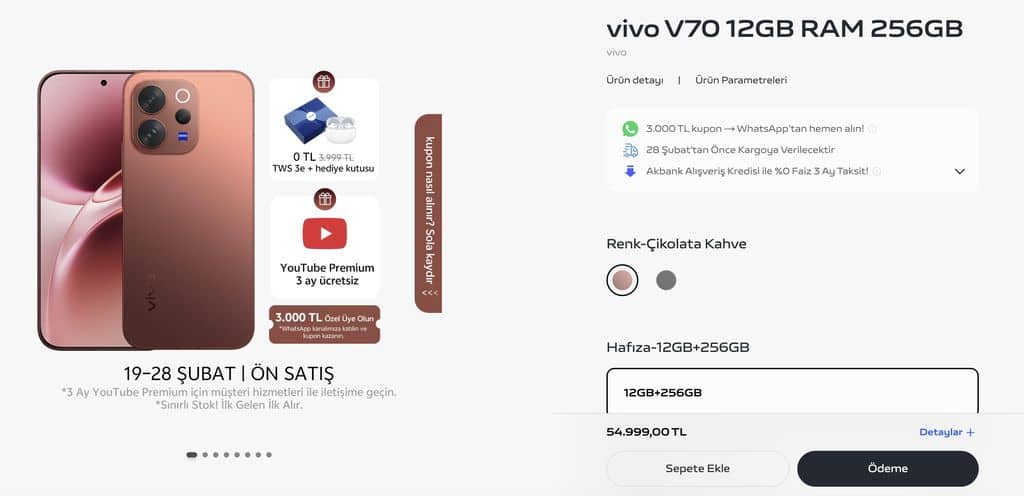 Ön sipariş döneminde kullanıcılara bazı ek avantajlar sunuluyor. 3.000 TL indirim sağlayan kupon kodu (3000V70) kampanya kapsamında yer alıyor. Ayrıca 3.999 TL değerinde TWS 3e kablosuz kulaklık ve vivo hediye kutusu da ön siparişe özel olarak veriliyor. Bunlara ek olarak, YouTube Premium için 3 ay ücretsiz üyelik fırsatı da kampanya dahilinde sunuluyor. vivo V70 modeli, markanın resmi online satış sitesi üzerinden sipariş edilebiliyor. Kampanya 28 Şubat 2026 tarihinde sona erecek.
