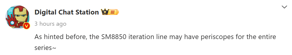 Digital Chat Station’ın bir sızıntısına göre SM8850 çipiyle donatılmış amiral gemisi bir telefonda periskop telefoto kamera ortaya çıktı. Bu çipin Snapdragon 8 Elite 2 olduğu tahmin ediliyor. Genellikle yeni işlemcileri ilk olarak Xiaomi markasında görüyoruz. Xiaomi 16’da da durum benzer olabilir ve pro modeldeki kamera lensi düz modele de eklenebilir.