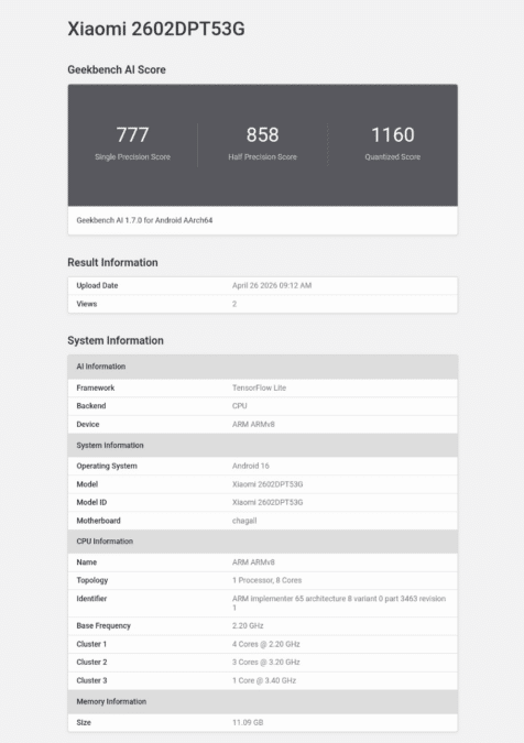 Standart modelin Geekbench AI’da ortaya çıkması ve temel özelliklerini göstermesi, lansmanın hızla yaklaştığını gösteriyor. Aşağıda görüldüğü gibi 2602DPT53G model numarasına sahip bir Xiaomi cihazı Geekbench AI veritabanında ortaya çıktı. Çok sayıda sertifikasyon kaydı bu cihazın piyasaya çıktığında Xiaomi 17T markasını taşıyacağını ortaya koydu.