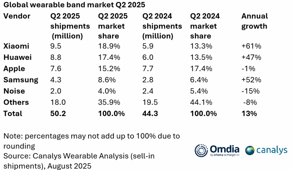 Rapora göre toplam giyilebilir bileklik sevkiyatları, yıllık bazda %13 artarak 50,2 milyon adede ulaştı. Bu artış, fitness takip cihazlarına ve akıllı bileziklere yönelik küresel talebin güçlü seyrini yansıtıyor. Özellikle Xiaomi Band ve Redmi Band serileri, uygun fiyatları ve akıllı özellikleriyle kullanıcıların ilgisini çekerek pazarda belirleyici rol oynadı.