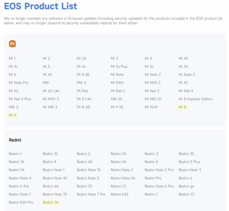 Xiaomiui sitesinde yer alan habere göre Çinli şirket Destek Sonu aşamasına gelen telefonların listesini yeniledi. Bununla birlikte listeye Xiaomi Mi 8, Xiaomi Mi 9 ve Redmi 7A modelleri dahil edildi. söz konusu telefonlar bundan sonraki süreçte hiçbir şekilde güncelleme desteği almayacaklar. Telefonlar sadece Android güncellemeleri değil, aylık güvenlik odaklı güncellemelerden de mahrum tutulacak.